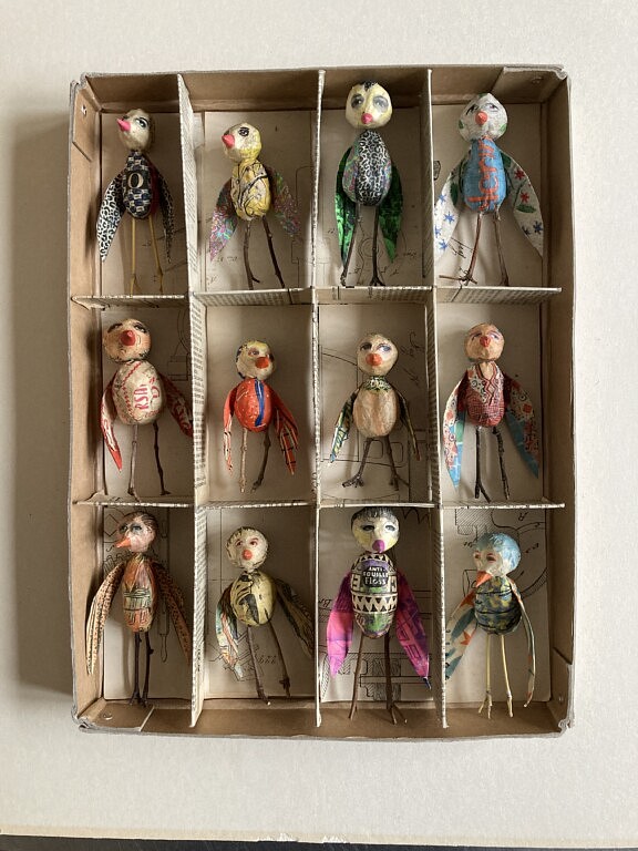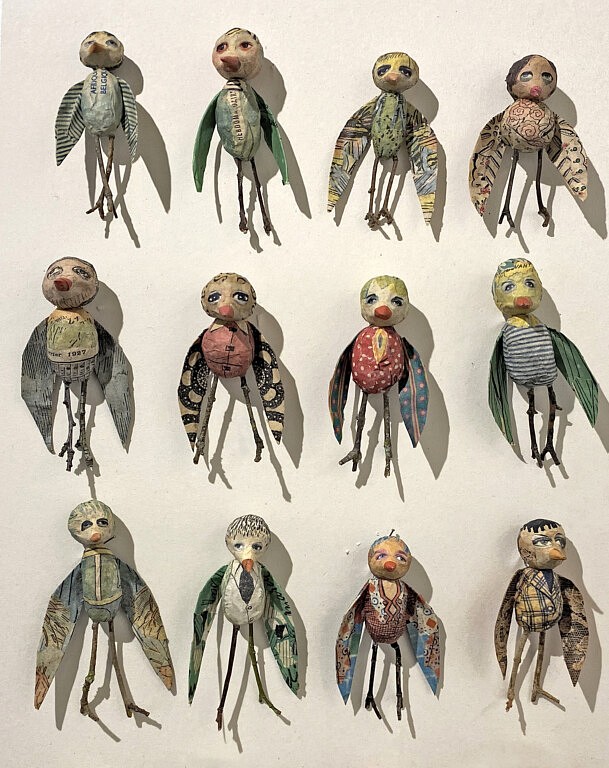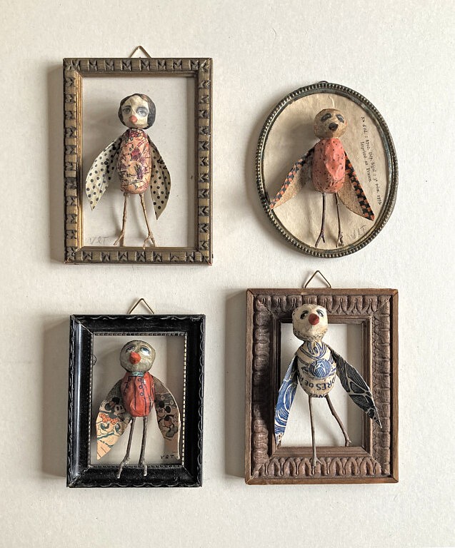 Mon sujet unique depuis quelques temps est les oiseaux — pas du tout réalistes que ce soit dit. Ce n’est pas une obsession, c’est juste un choix commode car les attributs d’un oiseau sont caractéristiques (bec, ailes, pattes), mais tolèrent bien des variations, y compris colorées. Une fois redressés, et gratifiés d’un œil humain, ces oiseaux prennent des expressions singulières, et ça me réjouit; je les découvre en les faisant. Avec les ratons laveurs, c’est possible mais plus compliqué. Je fais aussi de la céramique (avec décor au pochoir en papier à l’occasion) et des collages de pixels.
