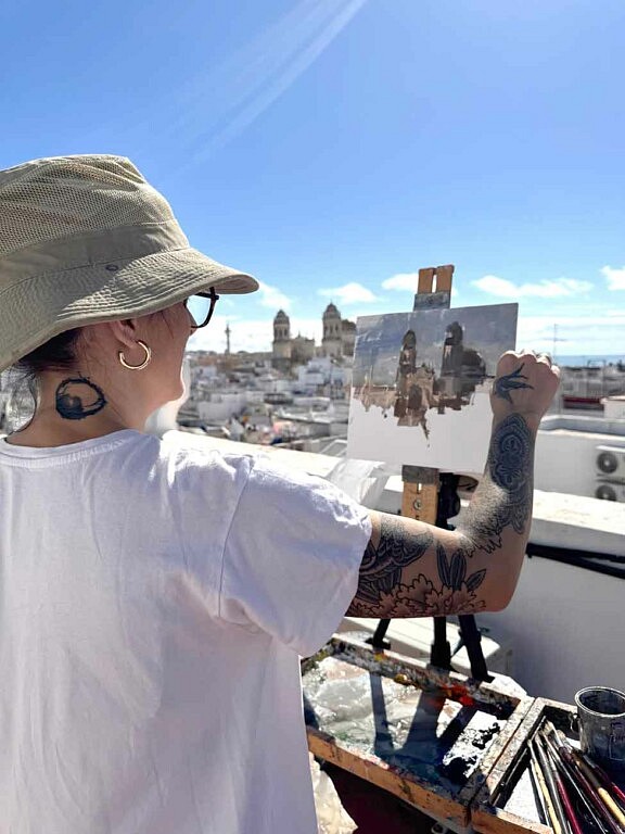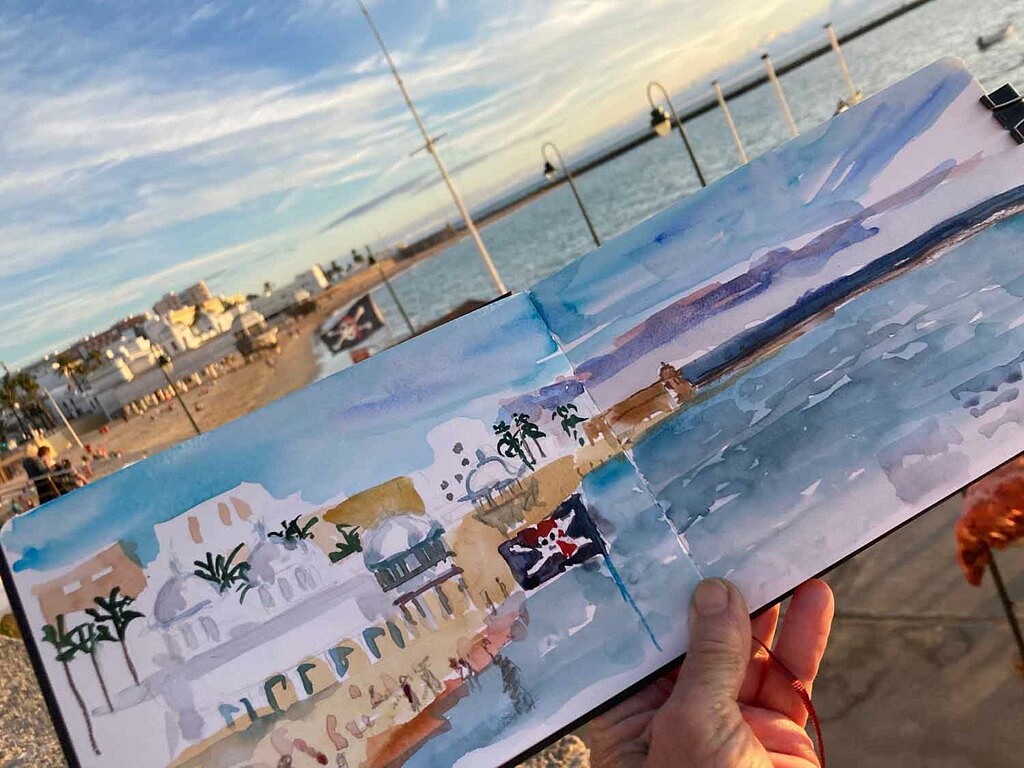 Ce weekend initial fut marqué par : découverte privilégiée de la ville, de son histoire, des balades inspirées, des moments conviviaux ou nous avons partagé tortillitas de camarones, chocos fritos, puntillitas et gambas avant de nous consacrer à un atelier d’urbansketching, et à des temps de pratique artistique dans les espaces foulés et dessinés par Delacroix en 1832… ! Le début d’une aventure partagée, celui d’une aventure artistique, humaine et lumineuse qui unit les villes, les artistes et les cultures.