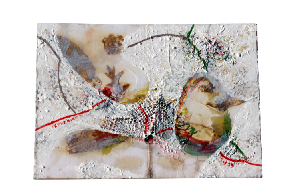 " Relief 2510b" Huile sur papier eco-imprimé marouflé sur contreplaqué, copeaux de bois, filets (21x30) 2025