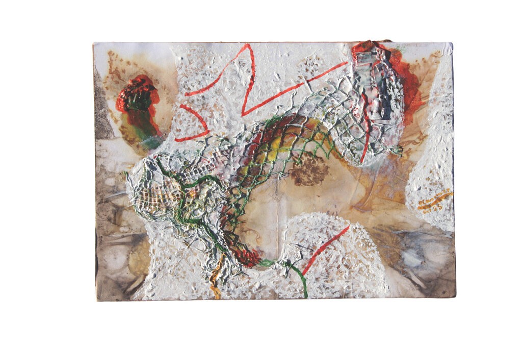 "Relief 2510a " Huile sur papier éco-imprimé marouflé sur contreplaqué,copeaux de bois, filets (21x30) 2025)