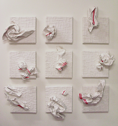 Emma Nony interroge le temps et comment il fait forme à travers la relation entre geste et matière. Elle explore le medium textile et les différentes facettes du pli.